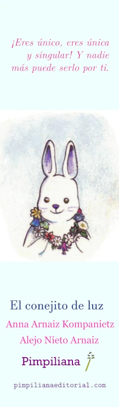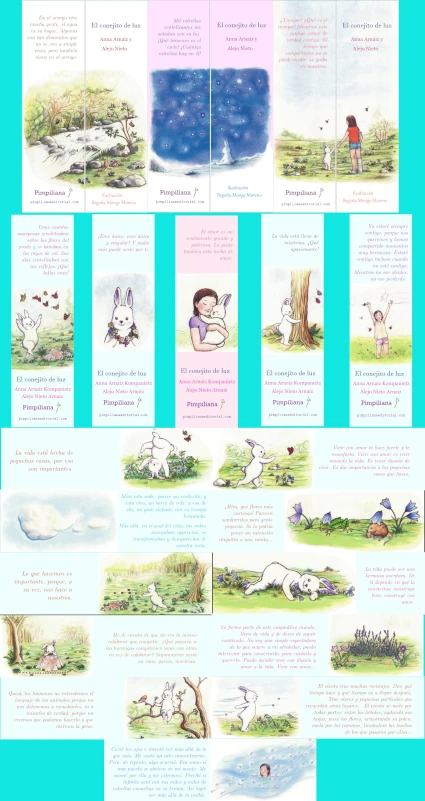Lote de marcapáginas de El conejito de luz. Compuesto por: 3 marcapáginas puzzles (dobles), 5 verticales y 11 horizontales. Dimensiones de cada marcapáginas individual: 60 mm x 204 mm.